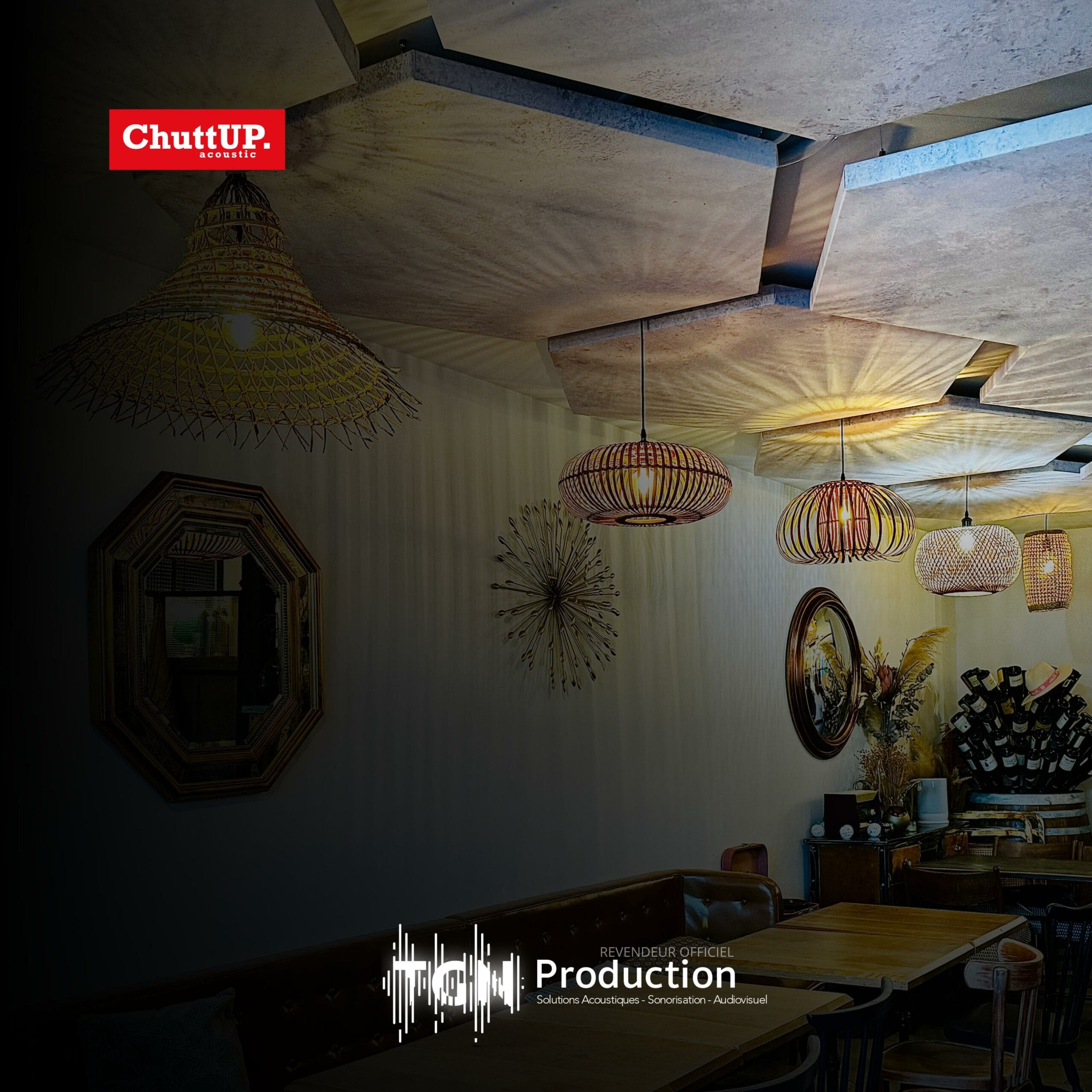 Pour répondre aux contraintes esthétiques de ce café situé sur le Cours Mirabeau, nous avons opté pour des panneaux acoustiques ChuttUP Acoustic assortis à la couleur du plafond. L’installation a été pensée pour se fondre visuellement dans l’architecture existante, tout en conservant les performances d’absorption acoustique indispensables à un cadre de restauration confortable.